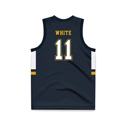 ETBU - NCAA Men's Basketball : Campbell White - Navy Basketball Jersey